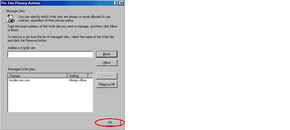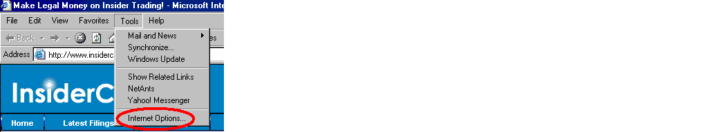 1. What patterns of inside trading is really a basis for serious consideration of a specific stock? Insiders may file SEC Form 4 for stock purchase because of reasons other than they think their stock may go up: they may have company stock compensation, or they may have to excises their stock options that are expiring soon. Generally, we should look for stocks that have several insiders, better if CEO or CFO is included, buy the stock at the market price within a short period of time, say 3 days. Each transaction should have a meaningful amount of shares and total proceeds, e.g., more than 500 shares and $1000. Further, check how many stocks the insiders have already own. If the transaction is the insider's first purchase, that may be because he/she just joined the company and is required to acquire some stock. Other than the transaction itself, investors should also check if the price has already moved a lot after the insider buy and if the stock itself is liquid so that a big transaction won't move the market badly. An example is CRAY. On 7/29/04 2:26pm, while the stock was trading at $3, InsiderCow showed the company's CEO and CFO had bought 45,000 shares in separate transactions. The next day the stock closed 6% higher. The next Monday rumor began on the street that IBM was going to buy CRAY for $6 a share cash, and the stock closed at $3.43, a 14% gain in two trading days. For more examples please refer to our homepage. 2. What patterns of selling indicate a problem with a stock? Insiders sell for different reasons. Bill Gates was continuing selling MSFT not because he's pessimistic about the stock but simply because he had too much stocks and he needed more cash. However, when several key insiders dump the stock continuously in a short period of time, each with big amounts, that may be a warning signal. Especially, avoid at any time stocks that have huge multiple insider sells. 3. Why does it keep making me re-authorize even though I've already logged in? Some browsers won't allow unknown websites to store cookies, which is used by InsiderCow.com to store user credentials. You need to tell the browser to allow cookies set by InsiderCow.com. For Internet Explore 6.0, follow the below 6 steps: